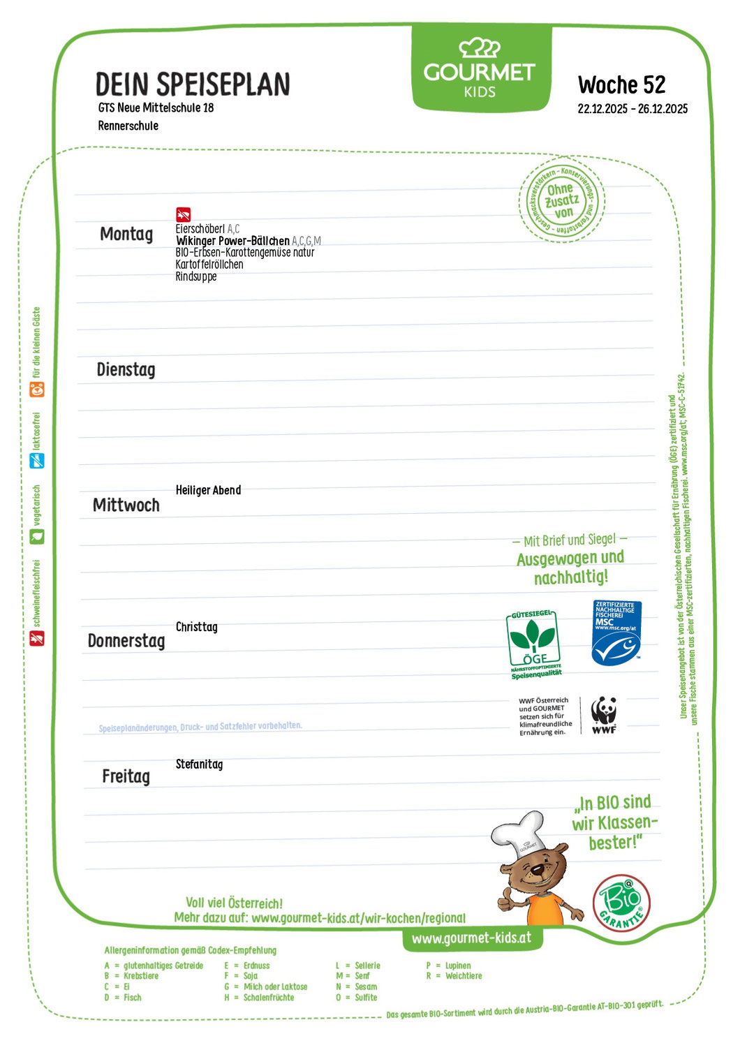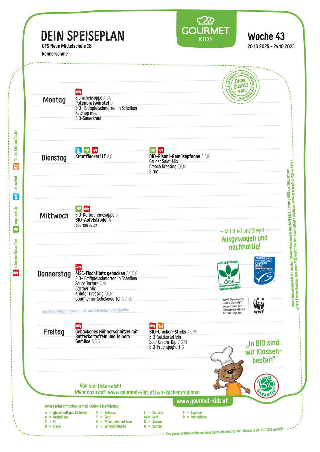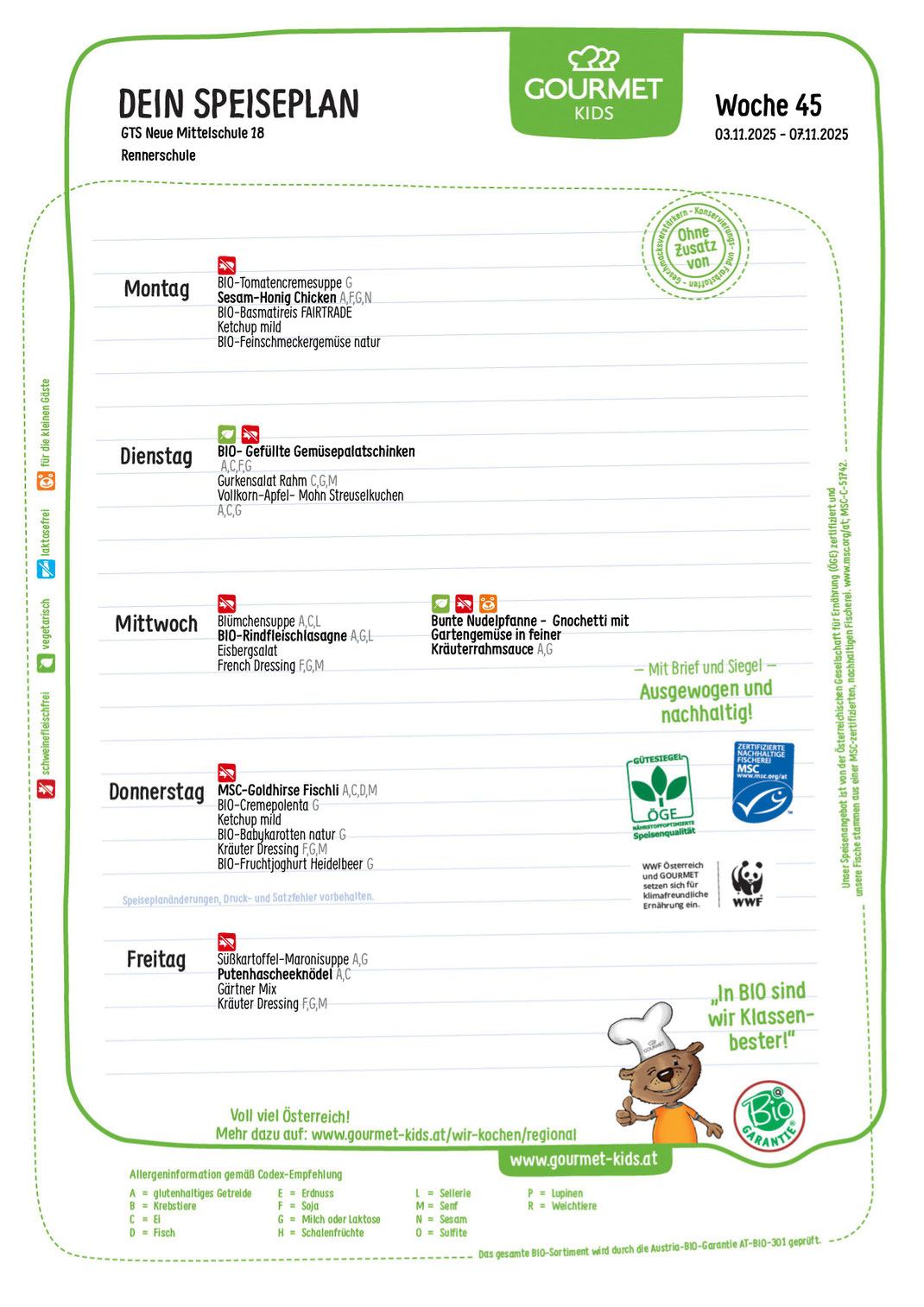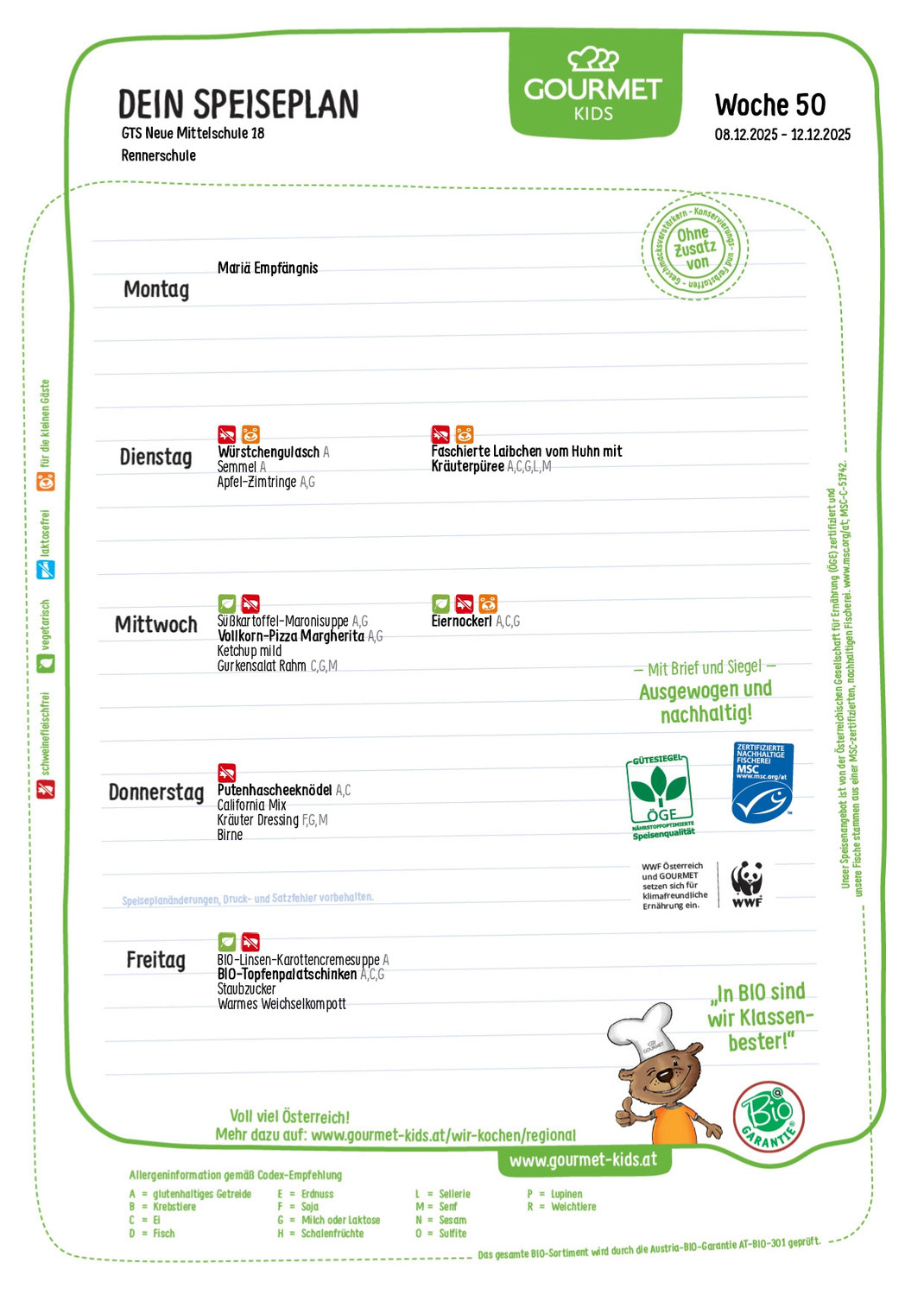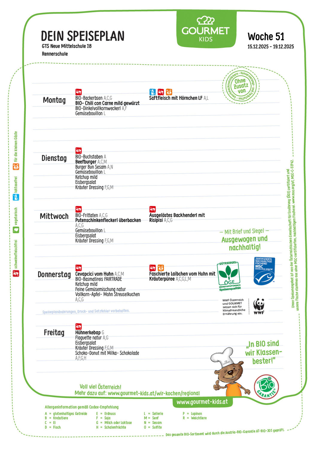 Der Speiseplan wird vom Magistrat Linz gemeinsam mit der Firma Gourmet erstellt. Änderungen vorbehalten. Die Schüler:innen können den aktuellen Wochenspeiseplan jederzeit in der Klasse, an der Kantinentür oder beim Infoboard (vor dem Konferenzzimmer) einsehen.